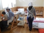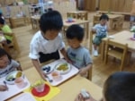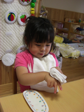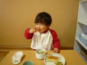 一人ずつに合わせて午前食を食べます。1回寝の子は食後ベッドへ行き寝ます。起きたら顔を拭いてもらいます。
