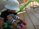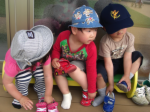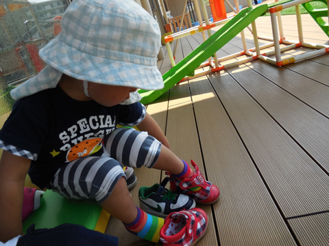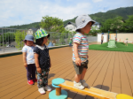 お散歩、園庭に担当保育士と行きます。午前睡が必要な子もいます。