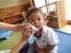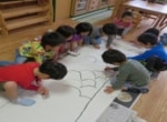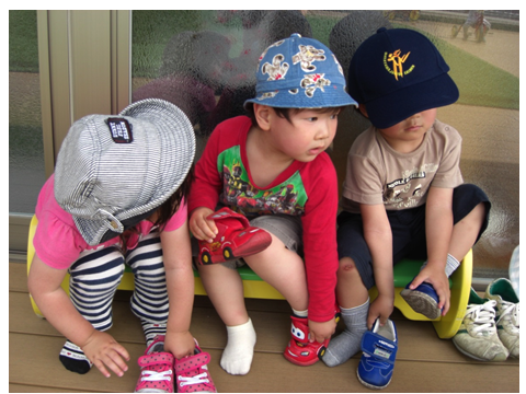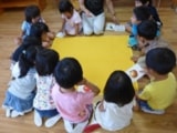課題遊びの時間帯は、自由参加型で年少児、年中児はその中に入って聞いている子、違う遊び(離れた場所)をしながら耳で参加している子、遠くから見ている子…参加の仕方は自由です。年長児は、自分の意志で全員が参加してほしいという願いがあります。(参加しない場合、その子が参加できるよう、また参加したくなるような環境設定をし声かけをしていきます。)このように一人ひとりの発達段階に合わせて就学までに体験してほしいことをどの子も体験できるよう無理じいすることなく参加できるように考えています。