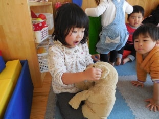 登園した子からお部屋で好きな遊びを自分で見つけて遊びます。さまざまな体験ができるよう発達に合わせておもちゃをおいています。