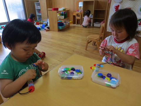 登園した子からお部屋で好きな遊びを自分で見つけて遊びます。