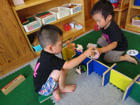 登園した子からお部屋で好きなあそびを自分で見つけてあそびます。さまざまな体験ができるような空間を考えています。