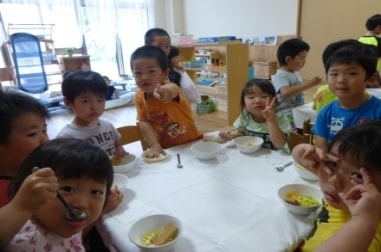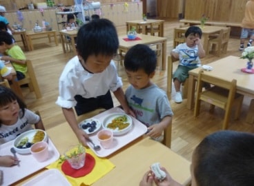 おやつの準備のお手伝いは当番制ではなく、やりたい子がユニホームを着て手伝います。自分から人のためにしてあげたいという子どもの主体性を重んじています。